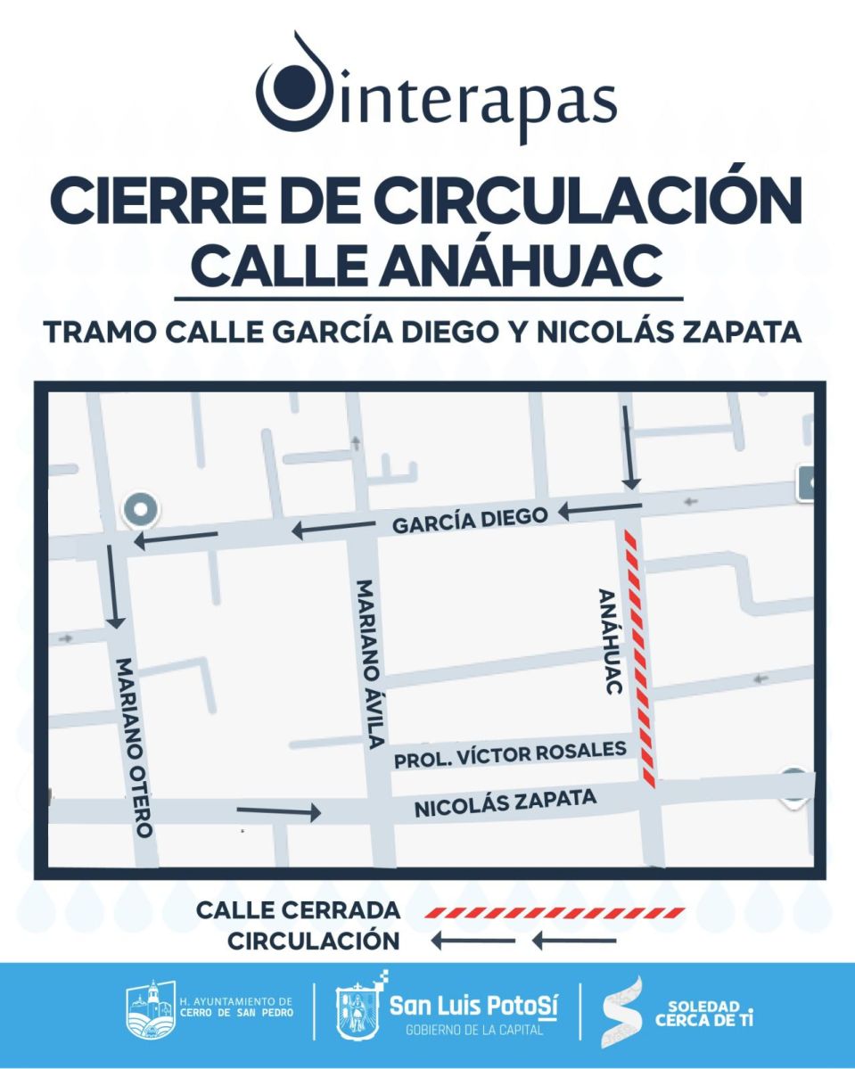 Debido a la importancia de esta vialidad, que conecta el norte con el centro de la ciudad, se ha implementado el cierre total de la calle durante el desarrollo de los trabajos, por lo que junto con la dirección de Vialidad de la Secretaría de Seguridad y Protección Ciudadana de la Capital, se estableció como vía alterna para automovilistas, la calle Mariano Otero en dirección sur, desde García Diego a Zapata.